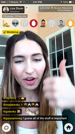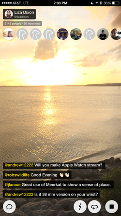 Everything that happens on Meerkat also happens on Twitter, via @replies. When a streamer goes live, a link is sent to followers in real-time push notifications. Everyone can watch within the application or on the web. Watchers are encouraged to participate in the stream via chat comments, Emojis, Likes and Restreams, which will share the stream they are watching to their followers in real time.